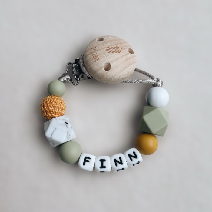 Schnullerkette mit Namen | Graugrünes Ockergelb